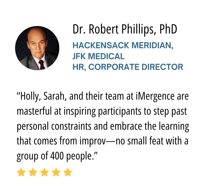 We’ve led experiential team-building sessions for groups of 50 to 500. Our fabulous facilitators are pros at reading the room, pivoting as needed, and creating a safe and fun environment for the participants. Plus, not only are we experts at working with corporate teams, we are also seasoned professional performers and entertainers — making us an ideal choice for large events and presentations.